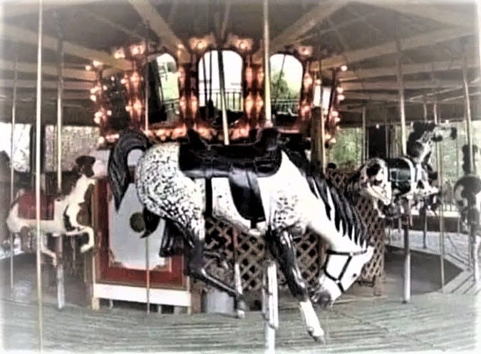 Never pass up a ride on a carousel even if you are afraid to ride. This one in the photo is definitely for the 'Advanced Rider'. They take a ride on the carousel which leads to seeing an ice-cream shop sign named Le Glaciér as mentioned in the journal.